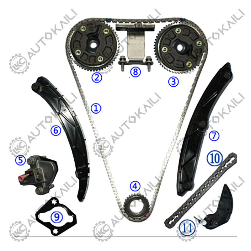 Kit perbaikan kami meliputi rantai waktu, faser poros cam (VVT), roda gigi poros cam, roda gigi poros engkol, rel panduan waktu, tensioner, dan bagian waktu lainnya.